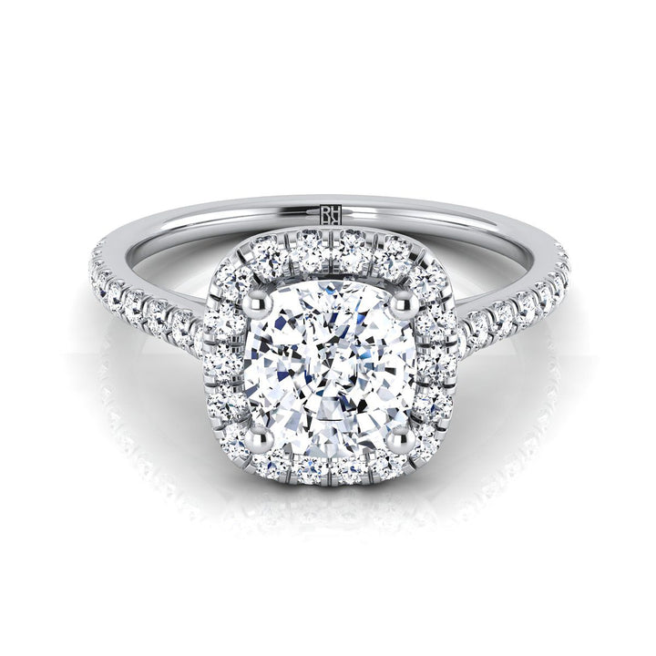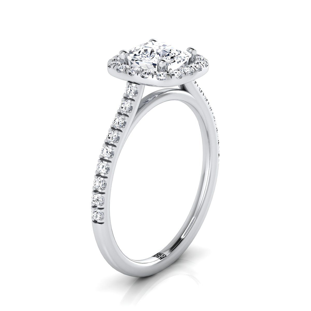 An Elegant Statement Of Style, This Cushion Cut Halo Engagement Ring With Diamond Pave Shank Showcases Brilliant Cut Diamonds (h-i/vs 0.30ctw) Beautifully Set In A Classic 14k White Gold Setting.