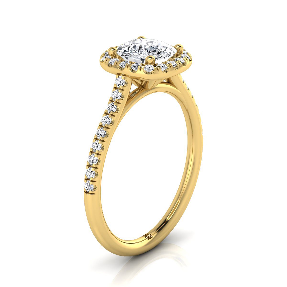 An Elegant Statement Of Style, This Cushion Cut Halo Engagement Ring With Diamond Pave Shank Showcases Brilliant Cut Diamonds (h-i/vs 0.33ctw) Beautifully Set In A Classic 14k Yellow Gold Setting.