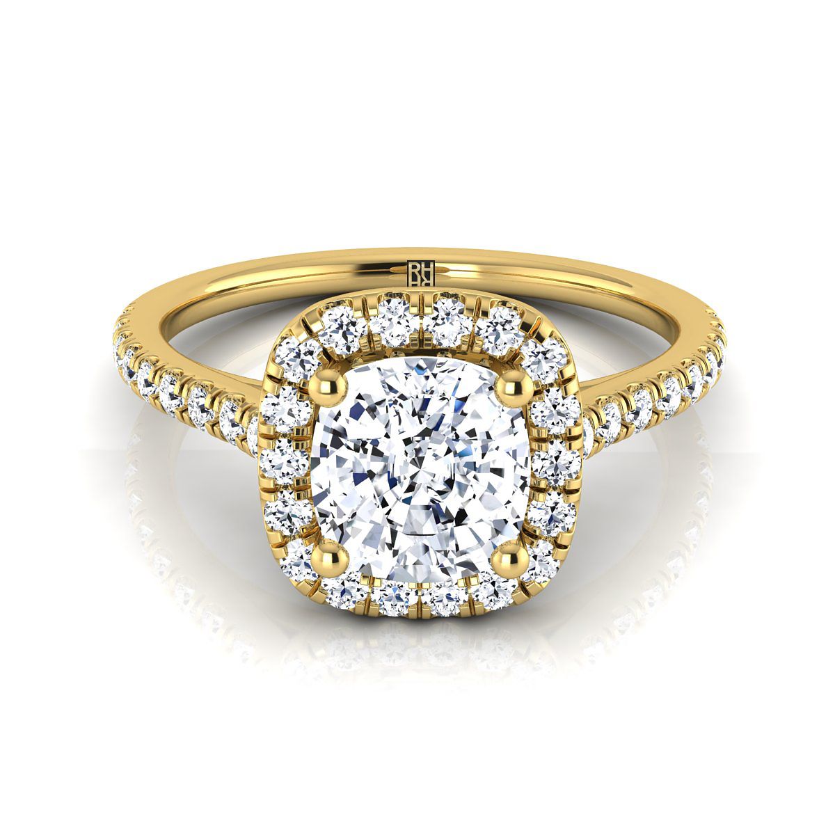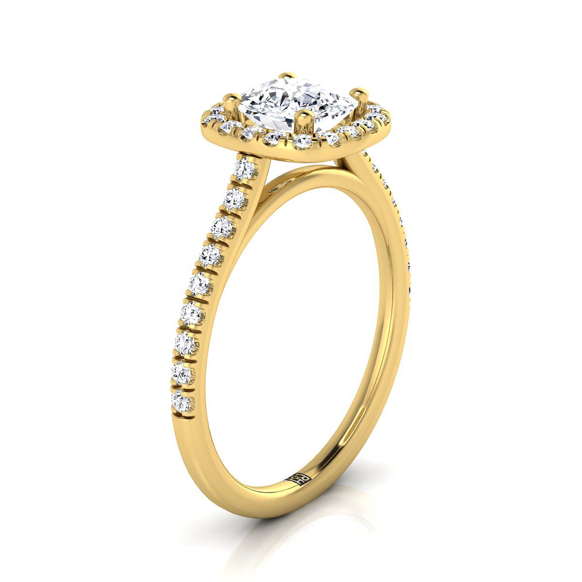 An Elegant Statement Of Style, This Cushion Cut Halo Engagement Ring With Diamond Pave Shank Showcases Brilliant Cut Diamonds (h-i/vs 0.30ctw) Beautifully Set In A Classic 14k Yellow Gold Setting.