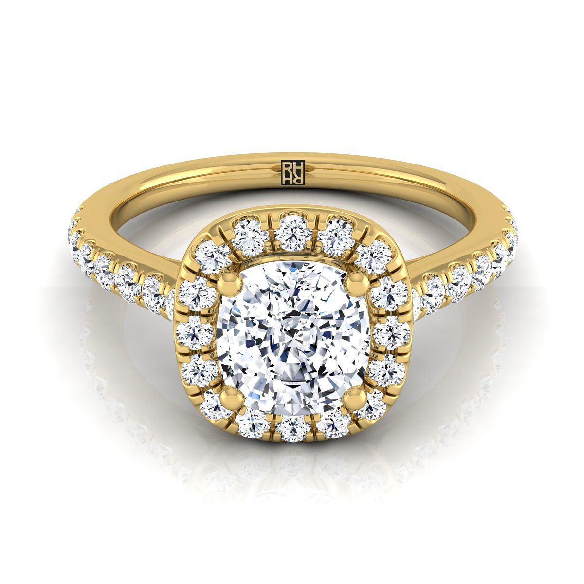 Classic With A Bold Twist, This Cushion Cut Diamond Halo With A Pave Shank Ring Showcases Brilliant Cut Diamonds (h-i/vs 0.50ctw) Beautifully Set In A Classic 18k Yellow Gold Setting.