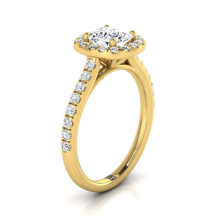 18K Yellow Gold Cushion Diamond Classic Pave Halo Cathedral Style Engagement Ring -1/2ctw
