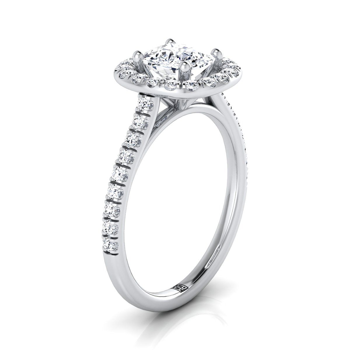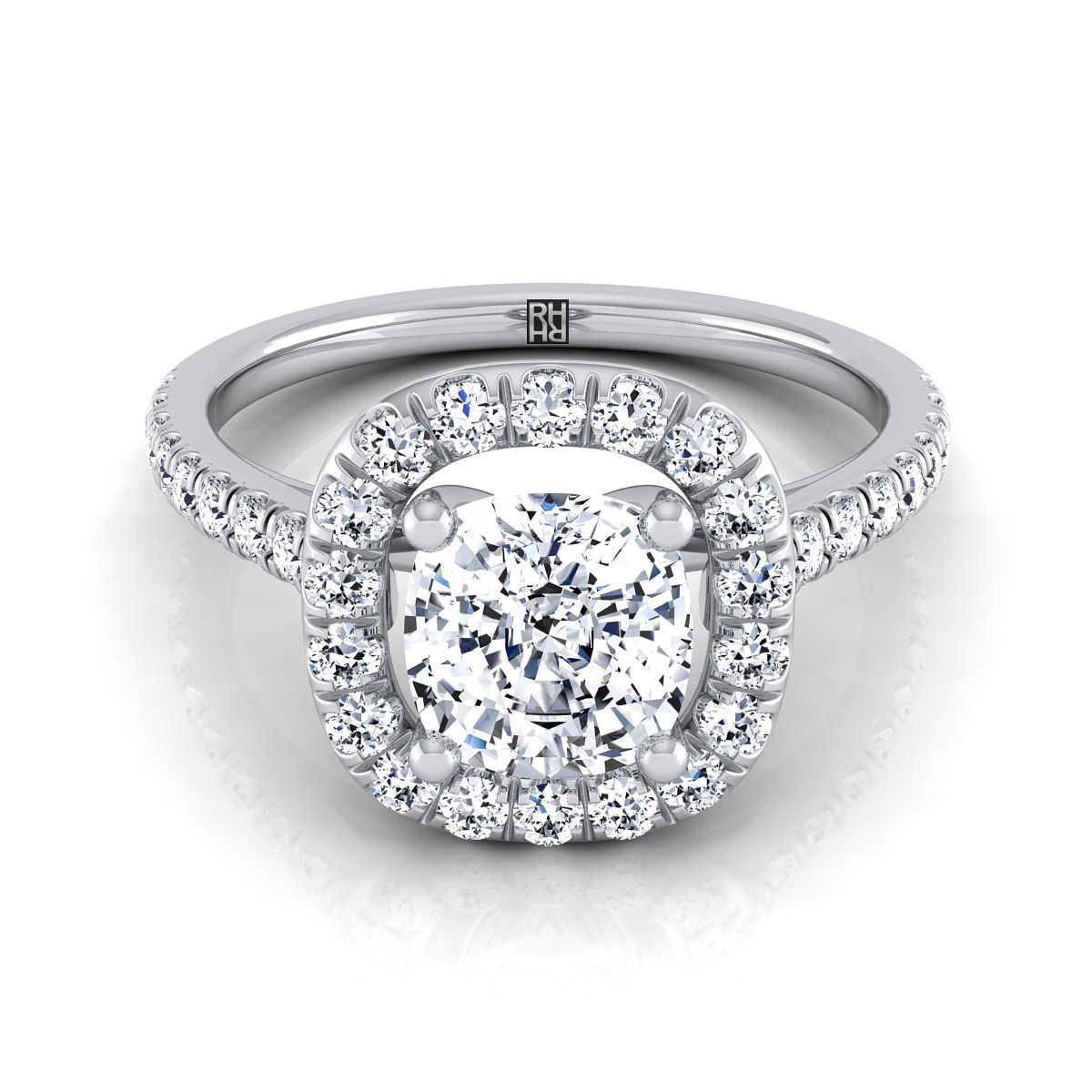 Classic And Elegant, This Cushion Cut Diamond Halo Engagement Ring With A Pave Shank Showcases Brilliant Cut Diamonds (h-i/vs 0.50ctw) Beautifully Set In A Classic Platinum Setting.