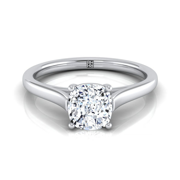 A Classic Statement Of Style, This Cushion Cut Solitaire Engagement Ring Showcases A Squared Edge Shank And Cathedral Setting In 18k White Gold