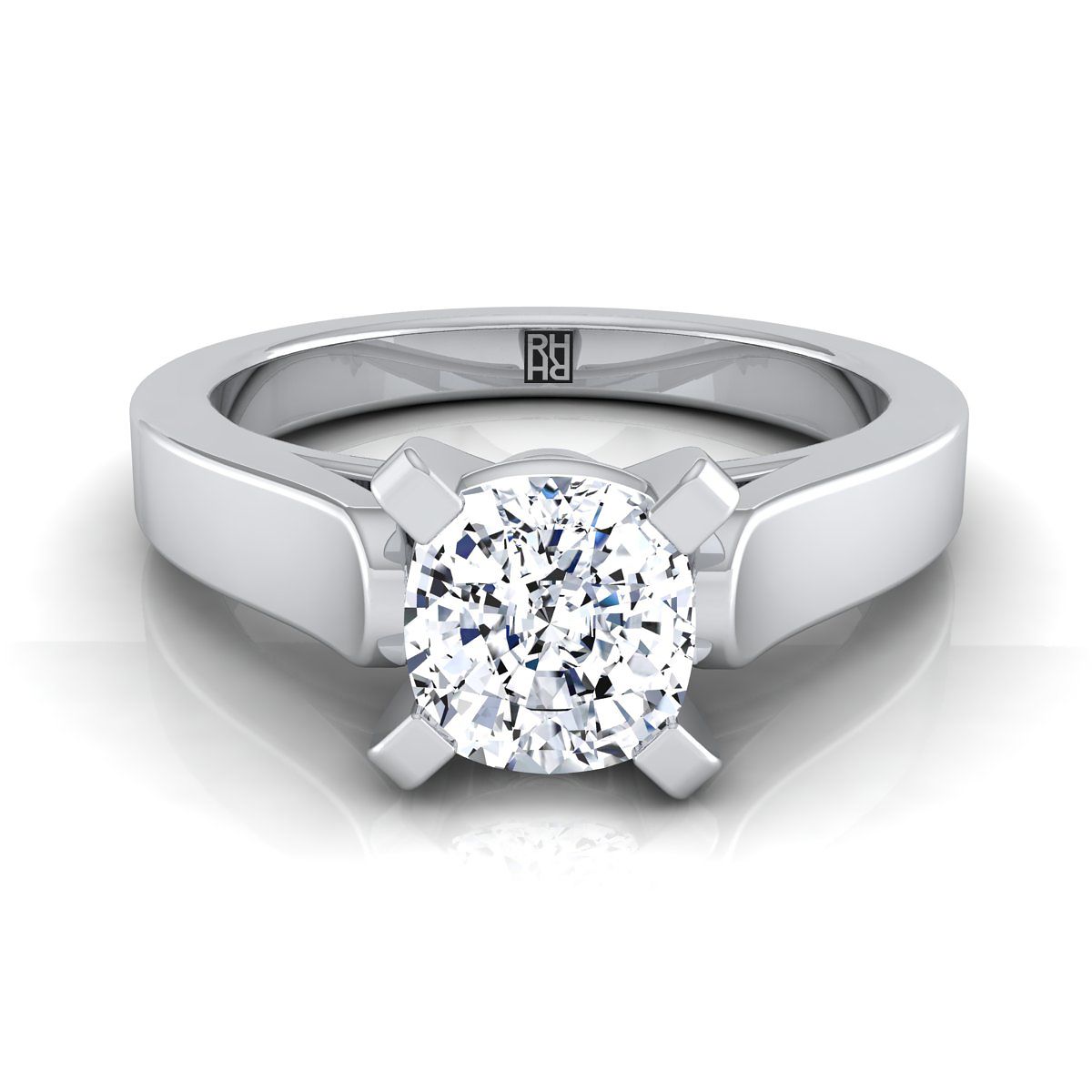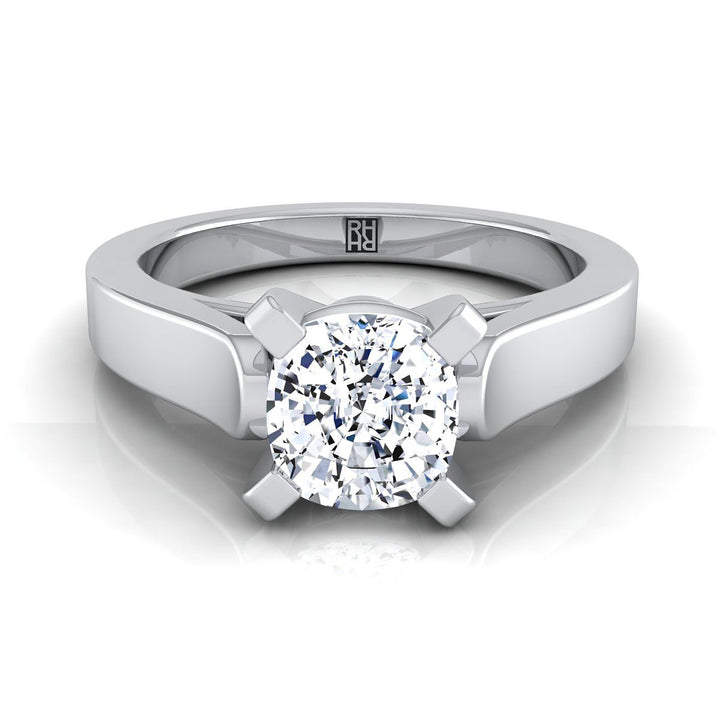 Understated Elegance, This Cushion Cut Diamond Solitaire Engagement Ring Showcases A Cathedral Center Setting With A High Polished Squared Edge Shank In Platinum