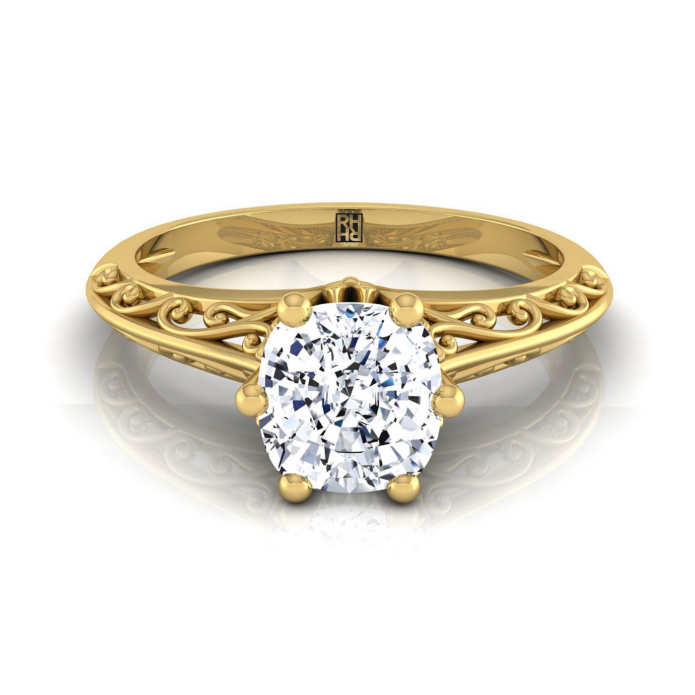 14K Yellow Gold Cushion Delicate Vintage Scroll Cut Out Solitaire Engagement Ring