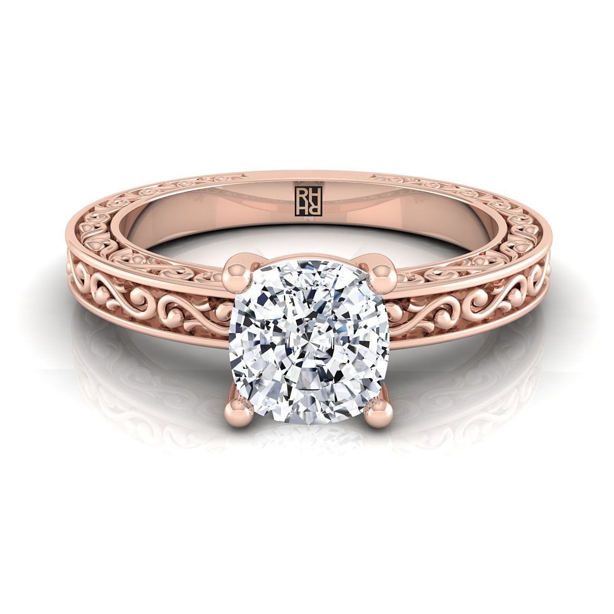 Understated Elegance, This Cushion Cut Diamond Engagement Ring Showcases A Scroll Engraved Design Shank With A Classic High Polish Finish In 14k Rose Gold