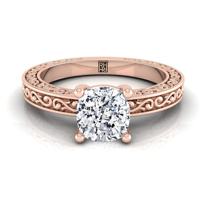 14K Rose Gold Cushion Hand Engraved Scroll Vintage Solitaire Engagement Ring