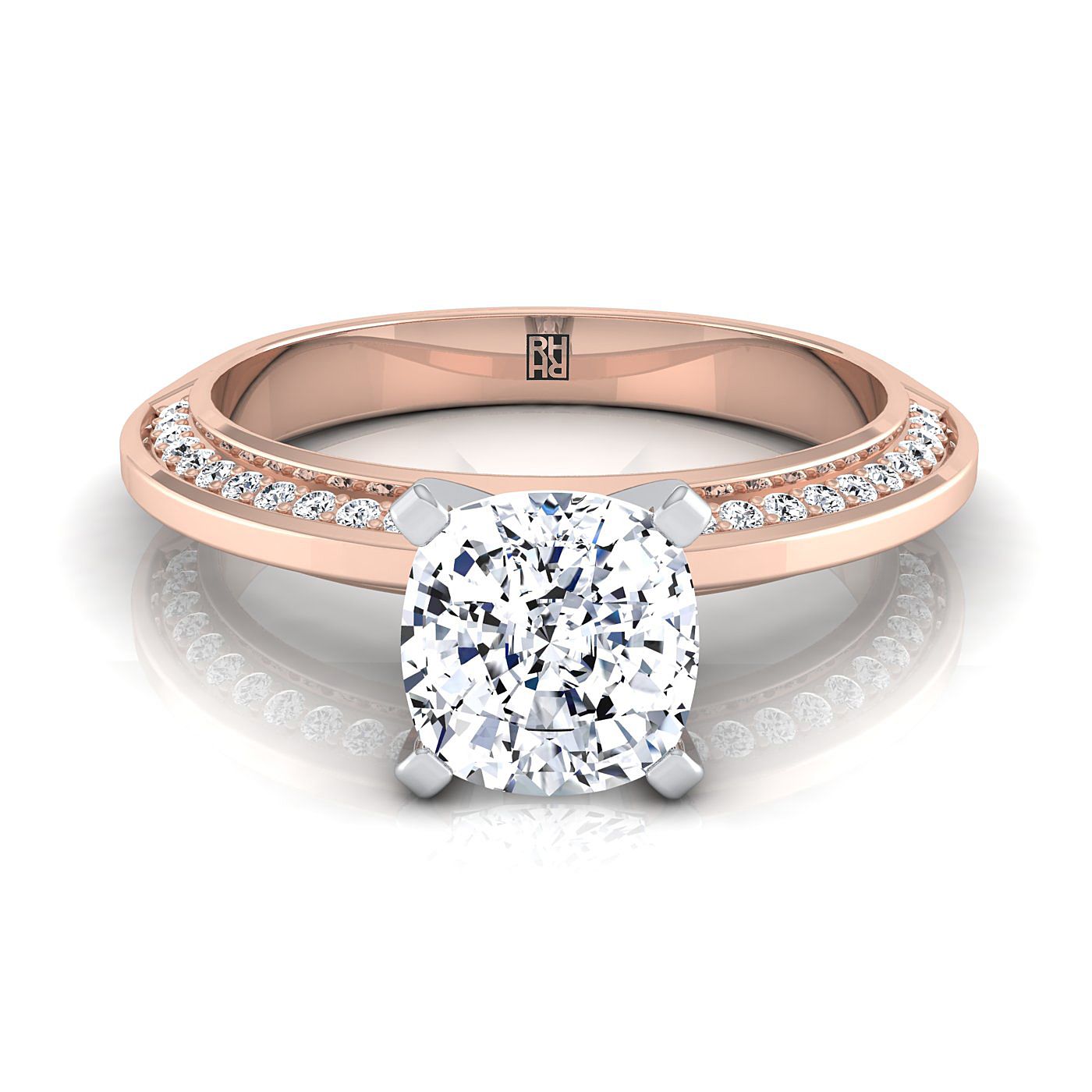 Classic Cushion Cut Center Diamond Engagement Ring With A Knife Edged Pave Gallery Showcasing Brilliant Cut Diamonds (h-i/vs 0.20ctw) Beautifully Set In An Elegant 14k Rose Gold Setting.