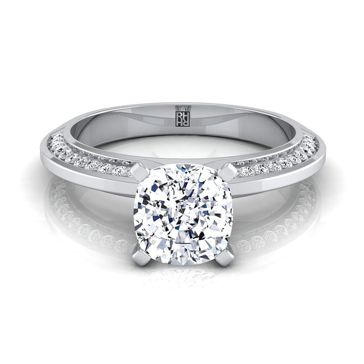 Classic Cushion Cut Center Diamond Engagement Ring With A Knife Edged Pave Gallery Showcasing Brilliant Cut Diamonds (h-i/vs 0.20ctw) Beautifully Set In An Elegant 18k White Gold Setting.