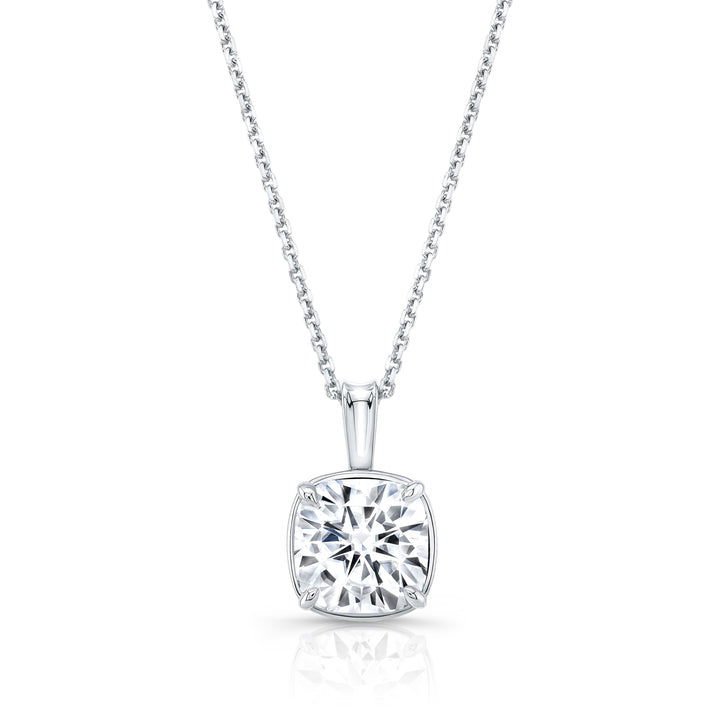 A cushion natural diamond solitaire pendant set in solid platinum — 3 ct. t.w., near-colorless, eye-clean, SI1-SI2 clarity, H-I color.