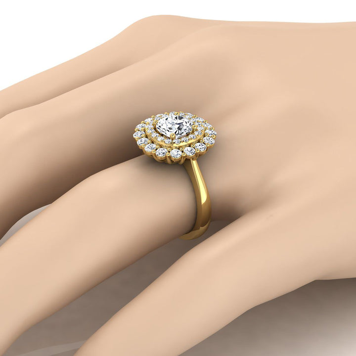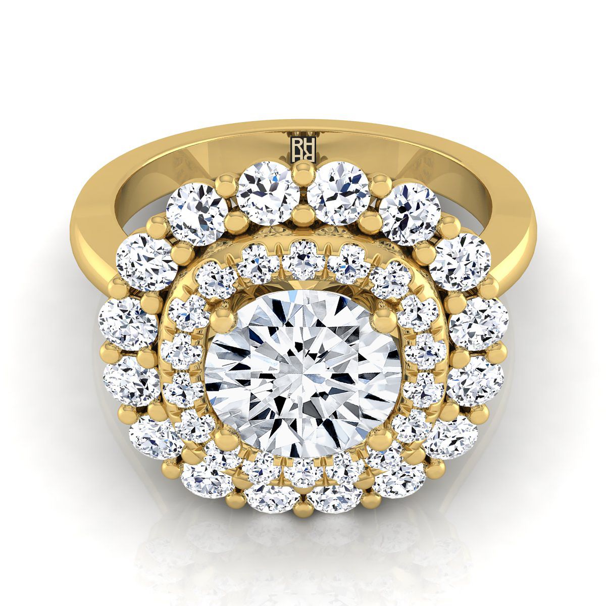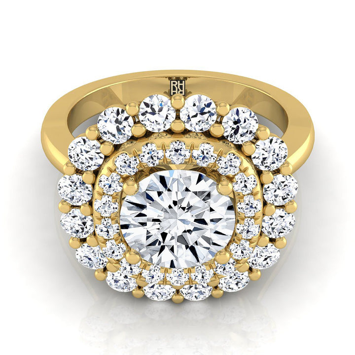 18K Yellow Gold Round Brilliant Diamond Double Halo Floral Sunburst Engagement Ring -1ctw