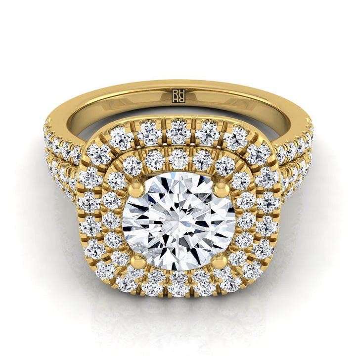 18K Yellow Gold Round Brilliant Diamond Four Row Split Shank Pave Double Halo Diamond Engagement Ring -7/8ctw