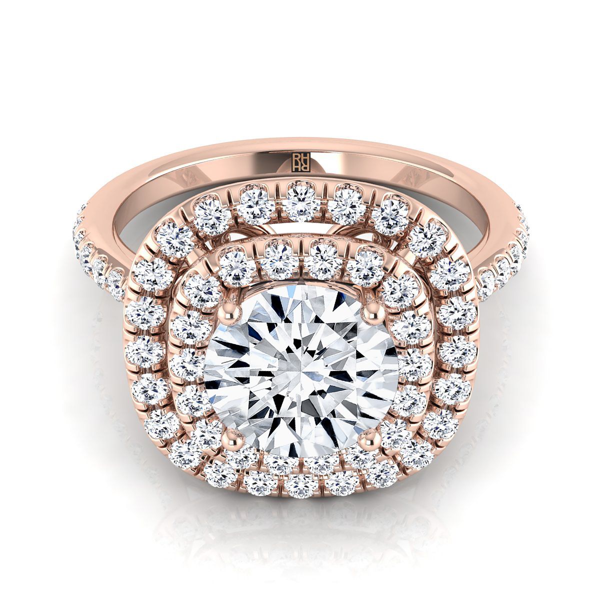 14K Rose Gold Round Brilliant Diamond Double Halo Scalloped Pavé Engagement Ring -1/2ctw