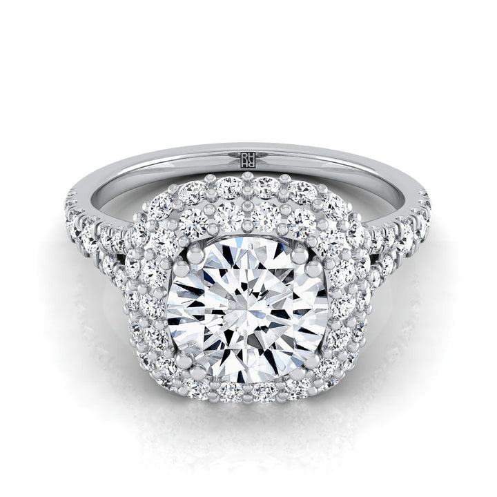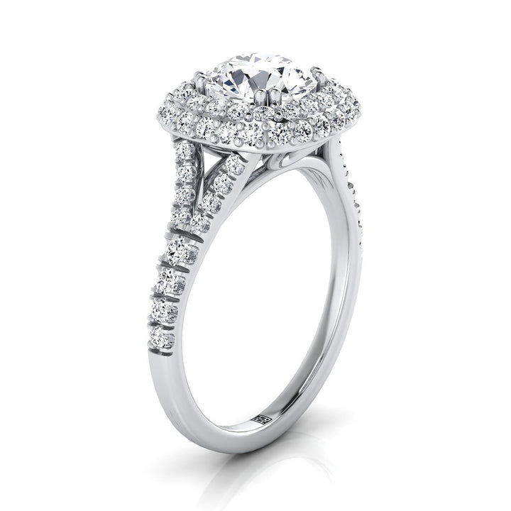 18K White Gold Round Brilliant Diamond Double Halo Split Shank French Pave Engagement Ring -5/8ctw