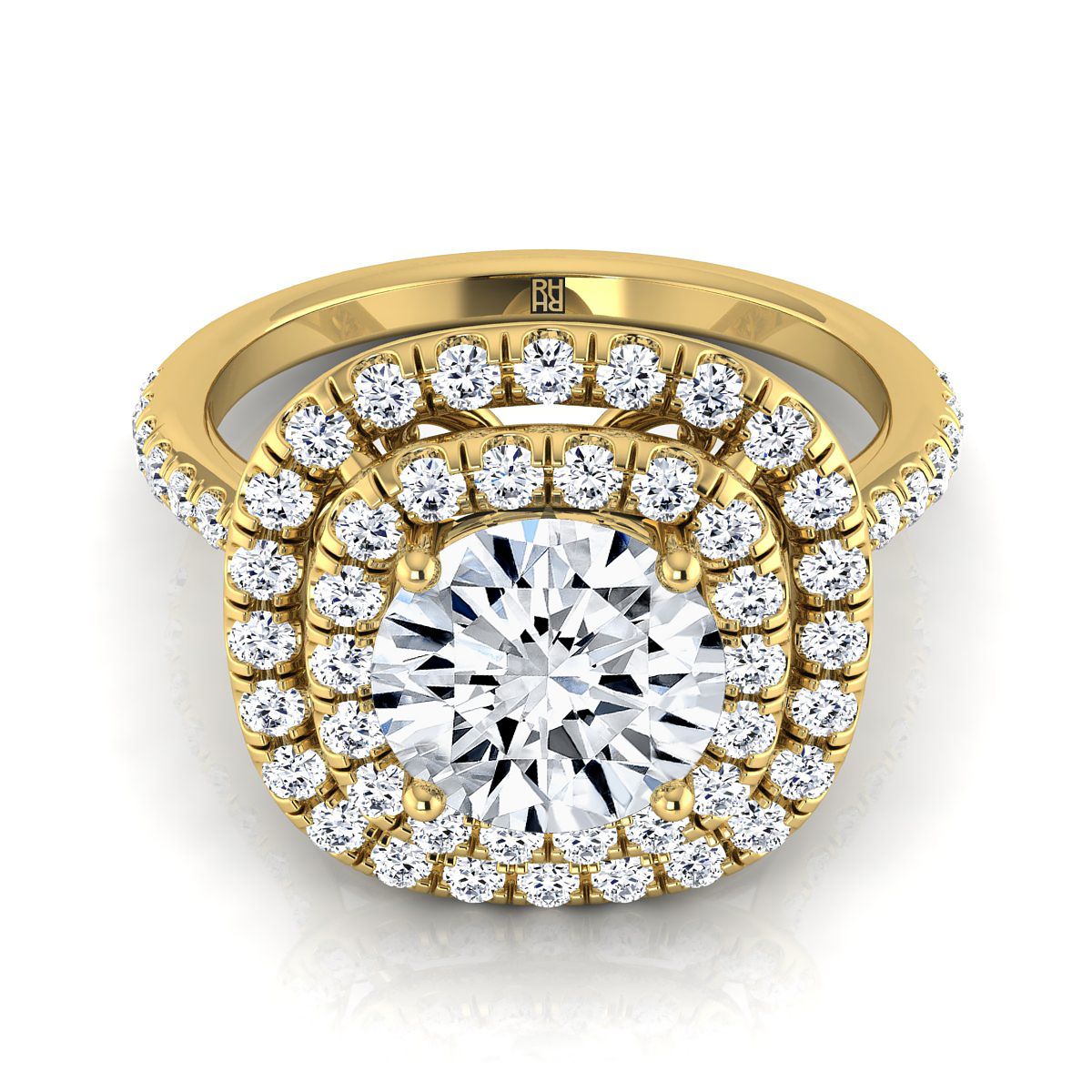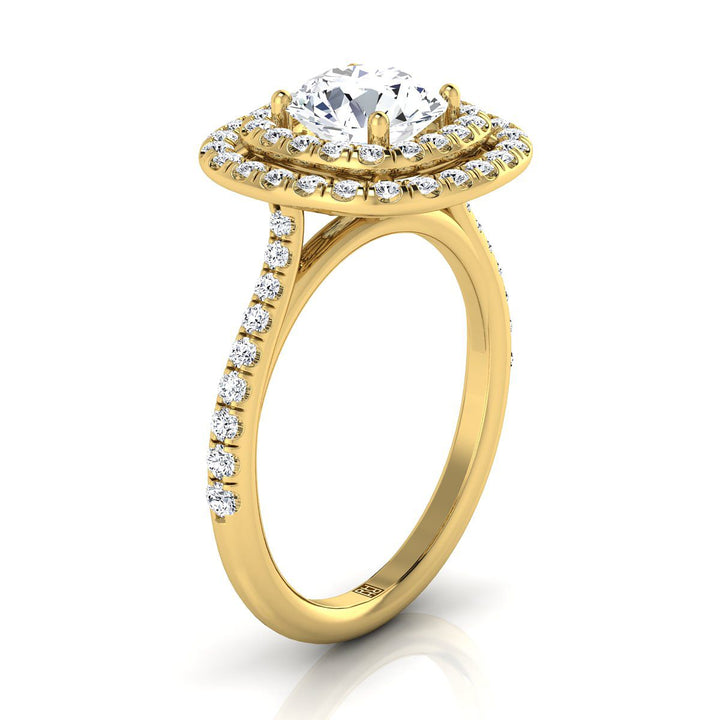 18K Yellow Gold Round Brilliant Diamond Double Halo Scalloped Pavé Engagement Ring -1/2ctw