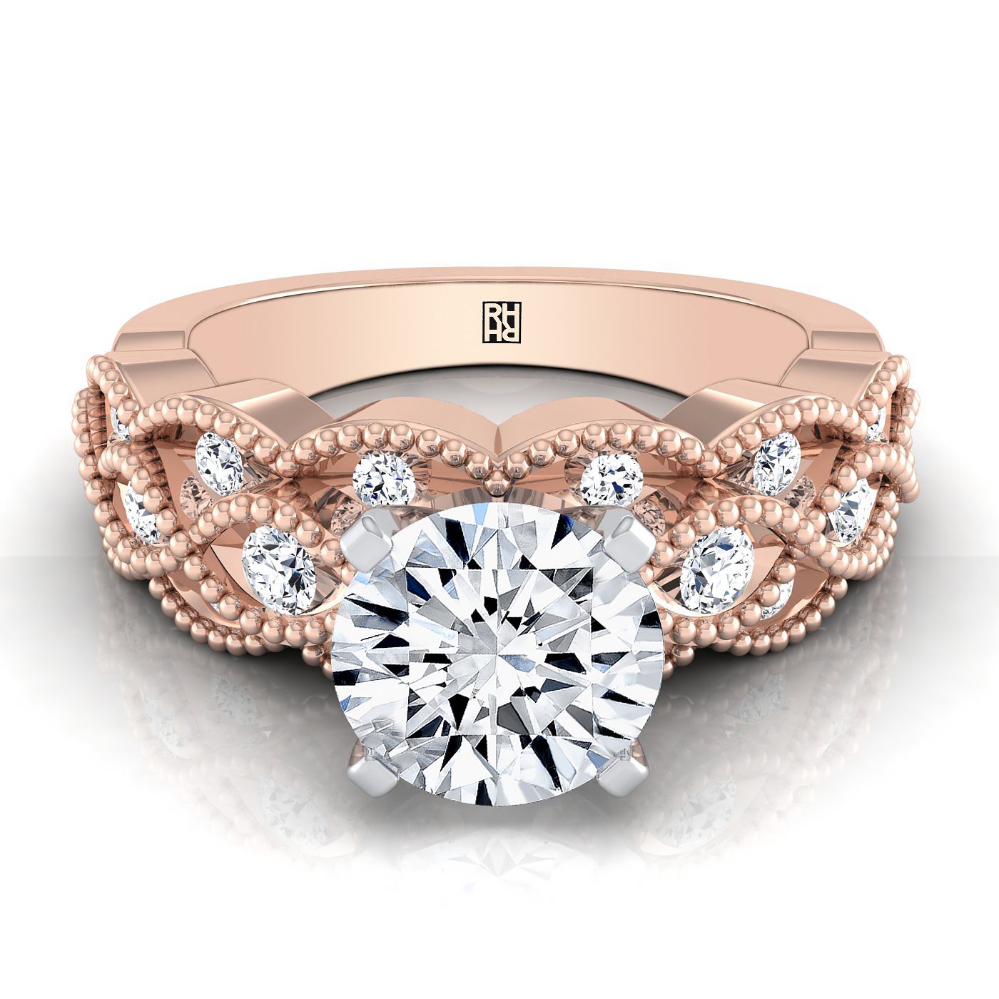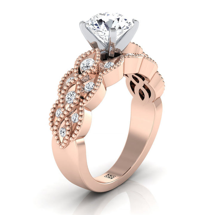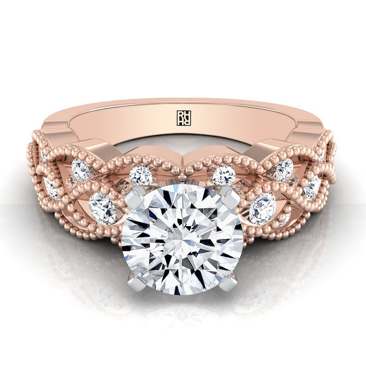 14K Rose Gold Round Brilliant Diamond Open Beaded Scalloped Twist Antique Diamond Engagement Ring -1/3ctw