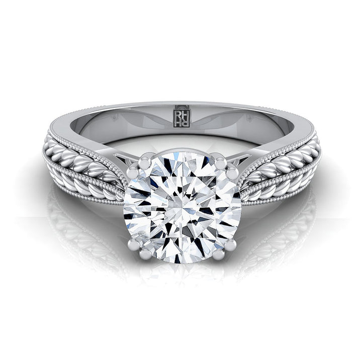 18K White Gold Round Brilliant Antique Wheat and Bead Pinched Solitaire Engagement RIng
