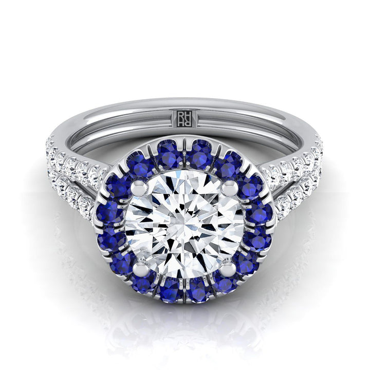 An Elegant Statement Of Style, This Diamond With Sapphire Accented Halo Engagement Ring Showcases Brilliant Cut Diamonds (h-i/vs 0.40ctw) With An Exquisite Pave Split Shank Mounted In A 18k White Gold Setting.