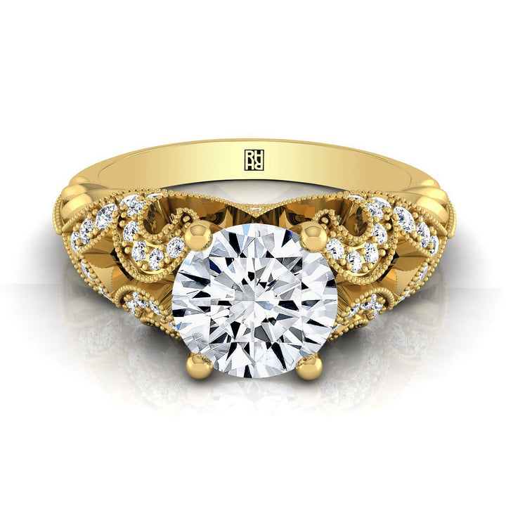 Vintage-inspired Diamond Engagement Ring With Scroll Work And Beading Detail Features Round Brilliant Melee (h-i/vs 0.33ctw) Set In A 14k Yellow Gold Mounting