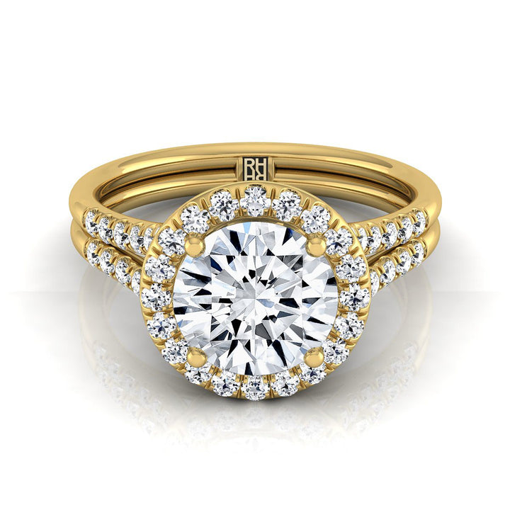 18K Yellow Gold Round Brilliant French Pave Split Shank Halo Engagement Ring -3/8ctw