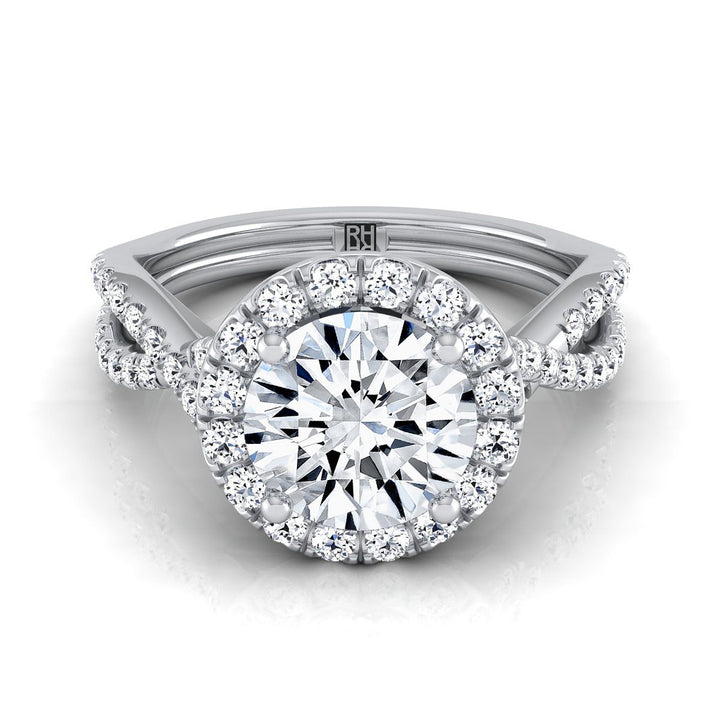 14K White Gold Round Brilliant Diamond  Twisted Scalloped Pavé Halo Center Engagement Ring -1/2ctw