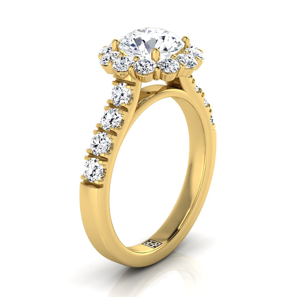 14K Yellow Gold Round Brilliant Diamond Luxe Style French Pave Halo Engagement Ring -1-1/10ctw