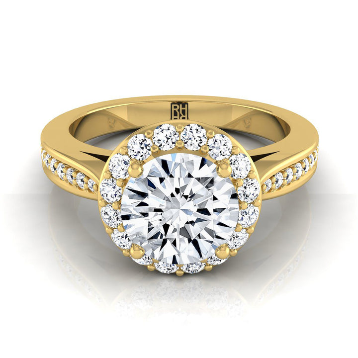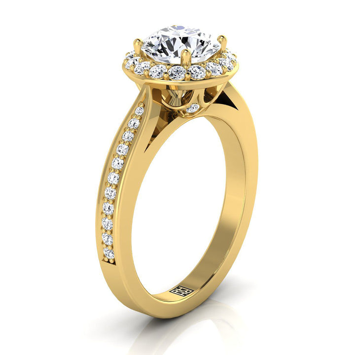 An Elegant Statement Of Style, This Halo Engagement Ring With Diamond Pave Shank Showcases Brilliant Cut Diamonds (h-i/vs 0.45ctw) Beautifully Set In A Classic 14k Yellow Gold Setting.