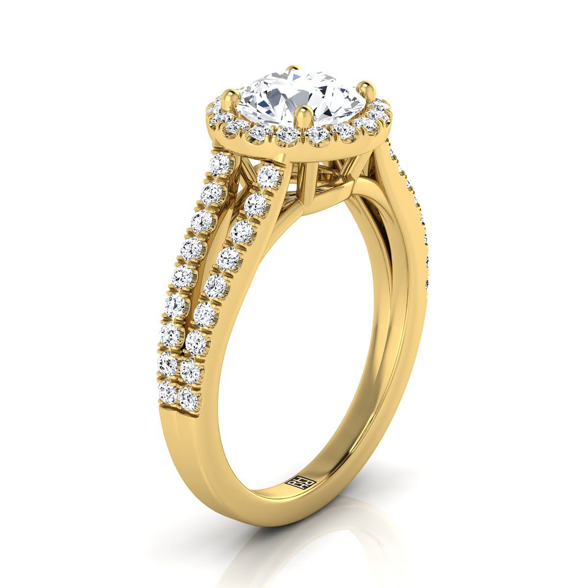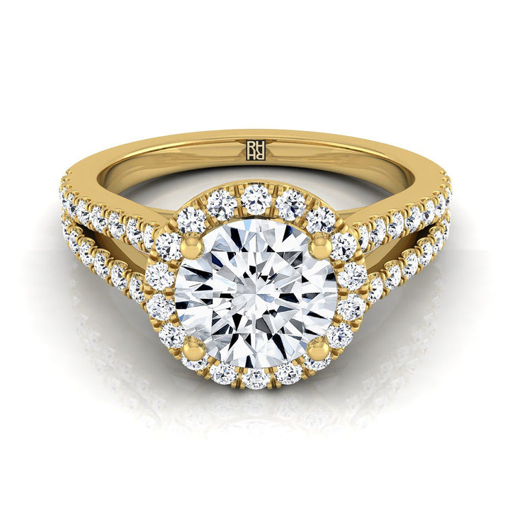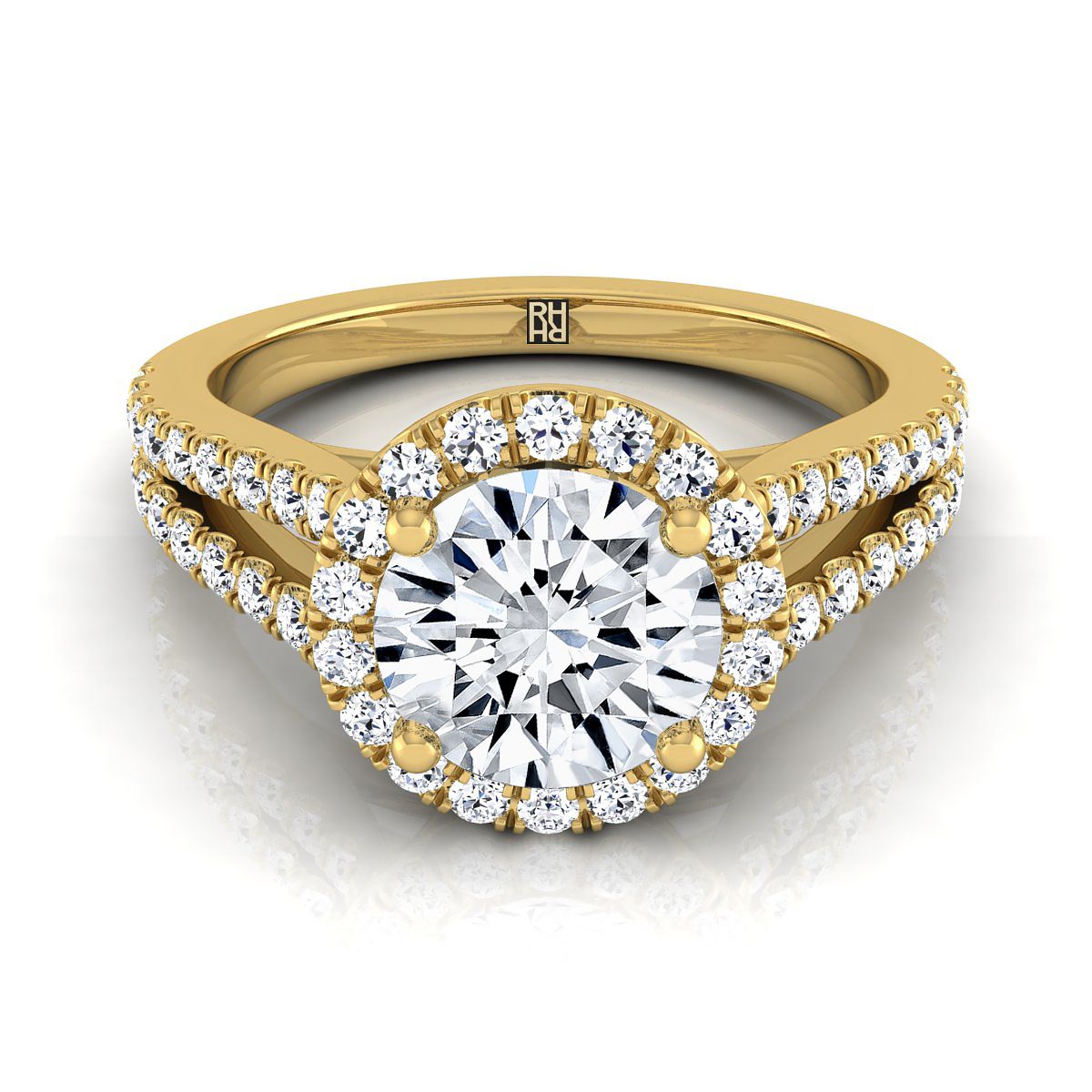 18K Yellow Gold Round Brilliant Split Shank and Diamond Pave Halo Engagement Ring -1/2ctw