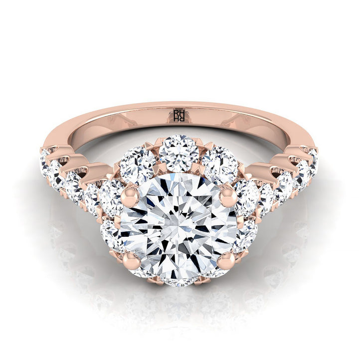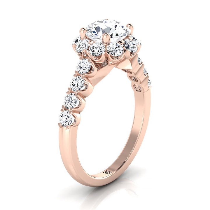 14K Rose Gold Round Brilliant Shared Prong Halo and Linear Side Set Diamond Engagement Ring -7/8ctw