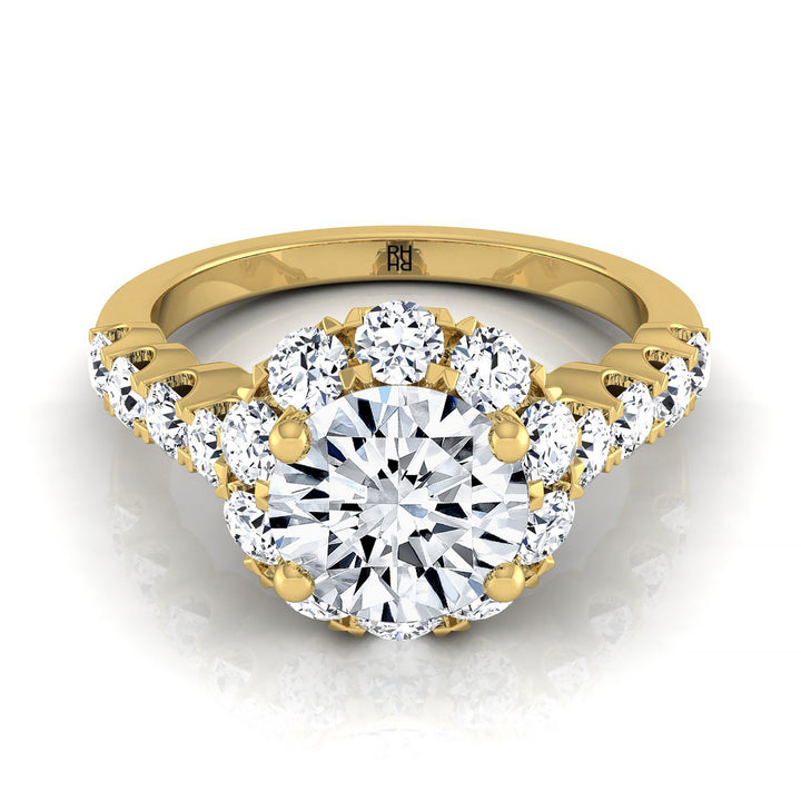 14K Yellow Gold Round Brilliant Shared Prong Halo and Linear Side Set Diamond Engagement Ring -7/8ctw