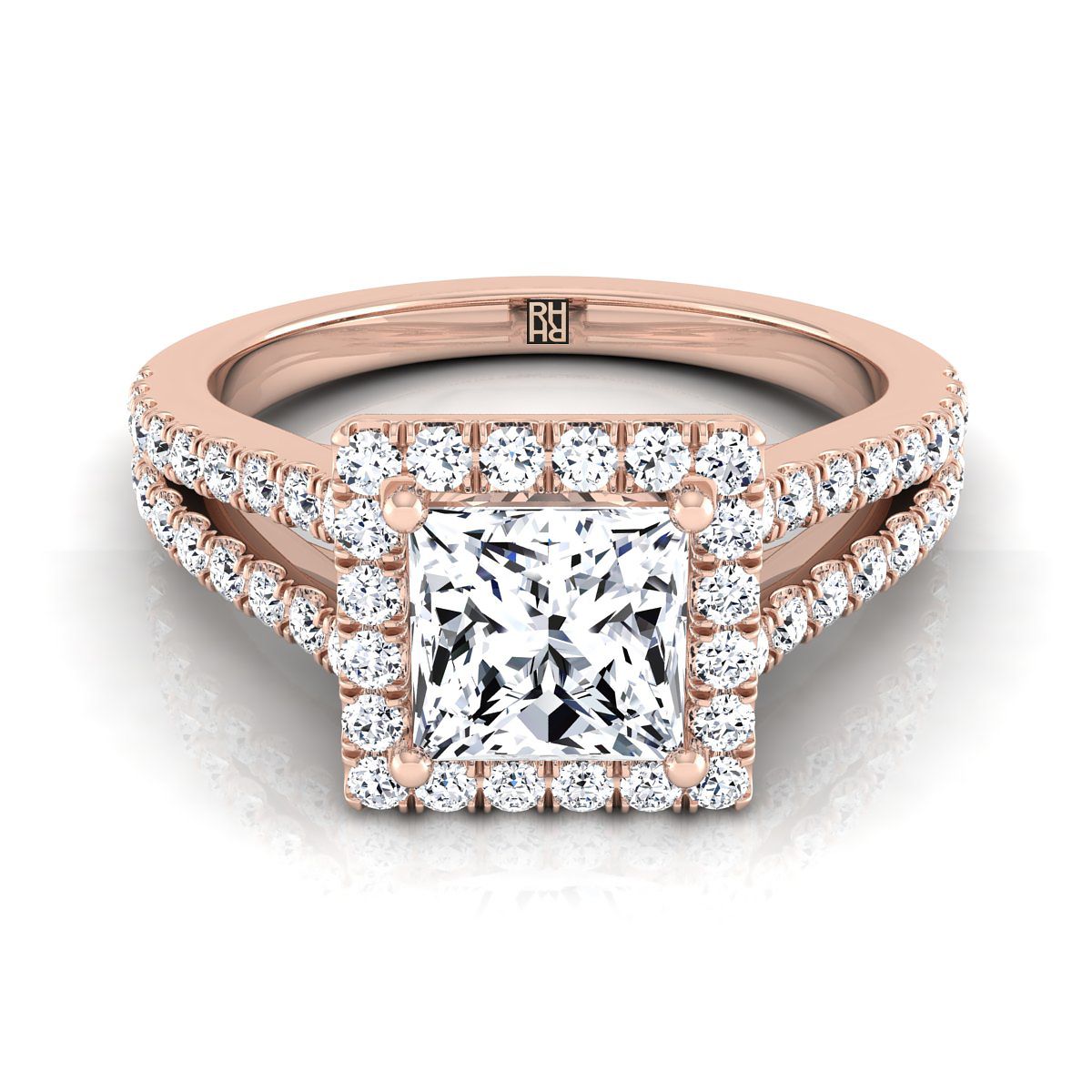 14K Rose Gold Princess Cut Split Shank and Diamond Pave Halo Engagement Ring -1/2ctw