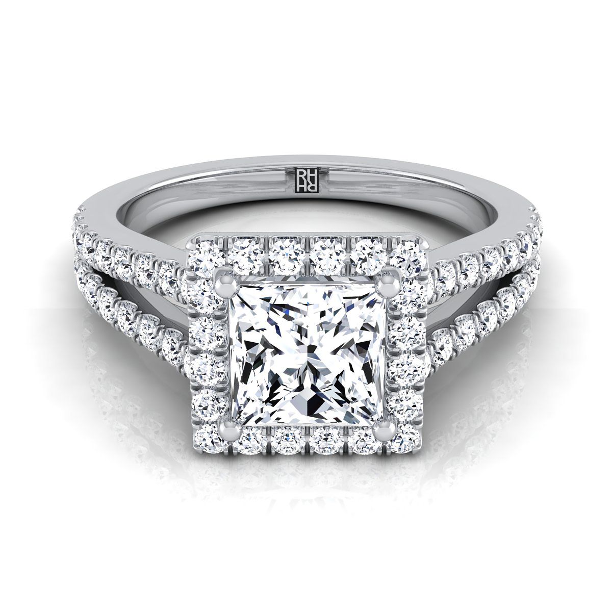18K White Gold Princess Cut Split Shank and Diamond Pave Halo Engagement Ring -1/2ctw