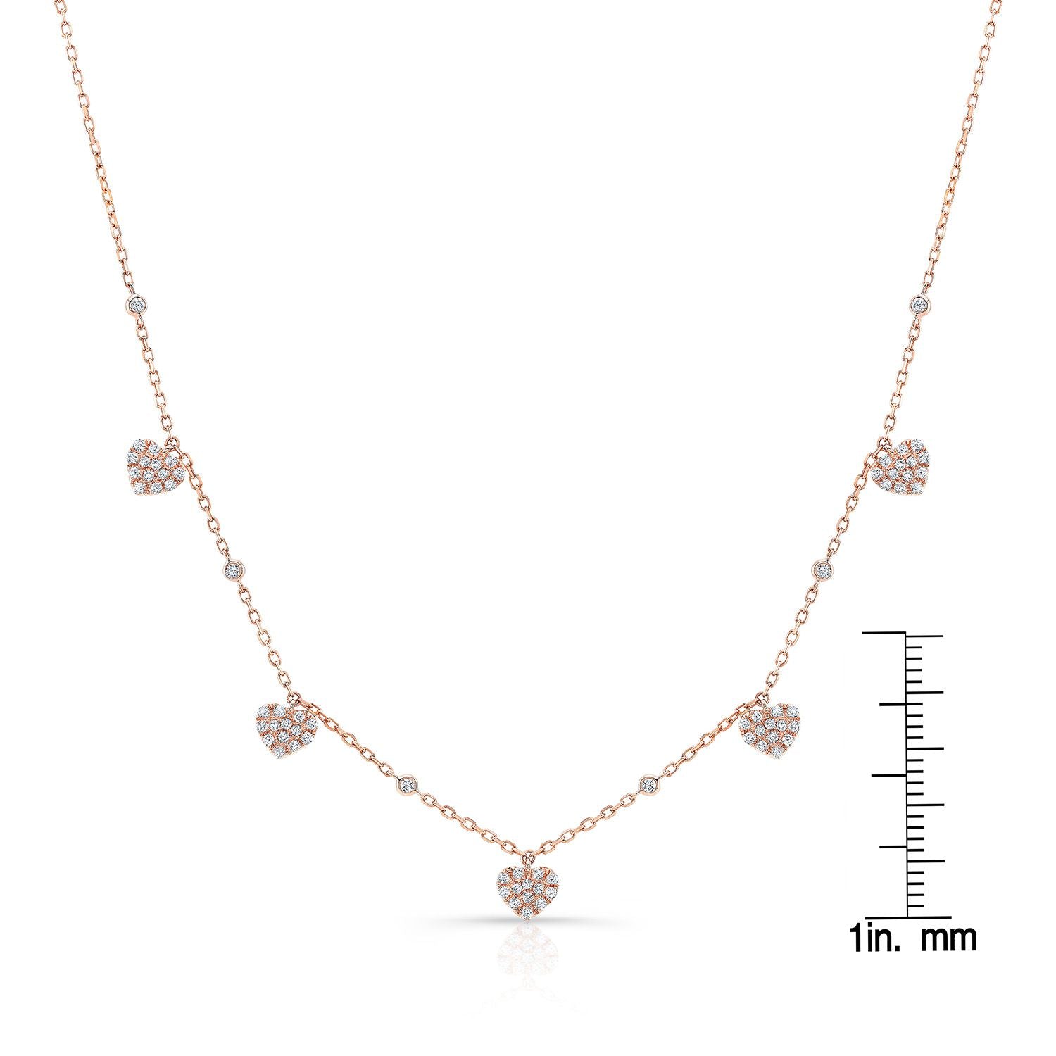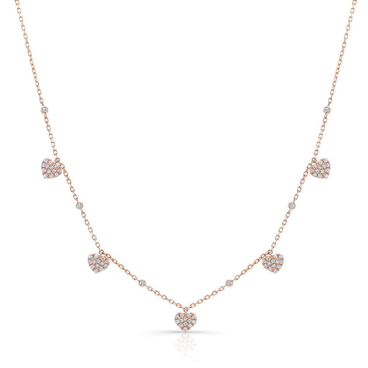 Diamond Pave Dangling 5-heart Station Necklace In 14k Rose Gold, 16-18 Adj Chn