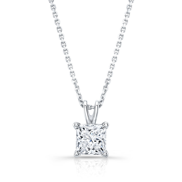A princess cut natural diamond solitaire pendant set in solid platinum — 2 ct. t.w., near-colorless, eye-clean, SI1-SI2 clarity, H-I color.