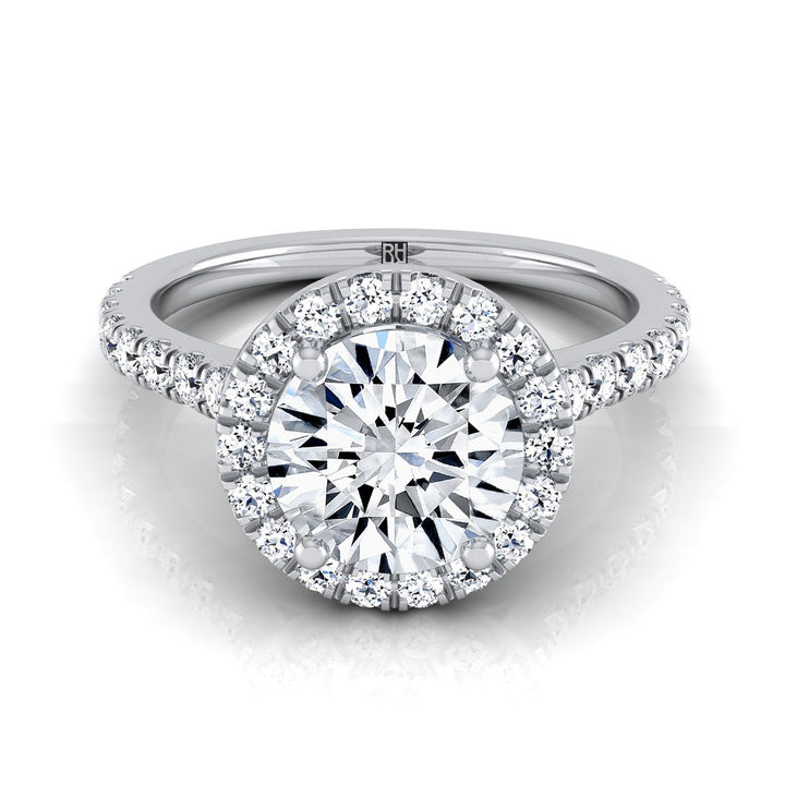 14K White Gold Round Brilliant Diamond Shared Prong Halo with French Pave Engagement Ring -3/8ctw