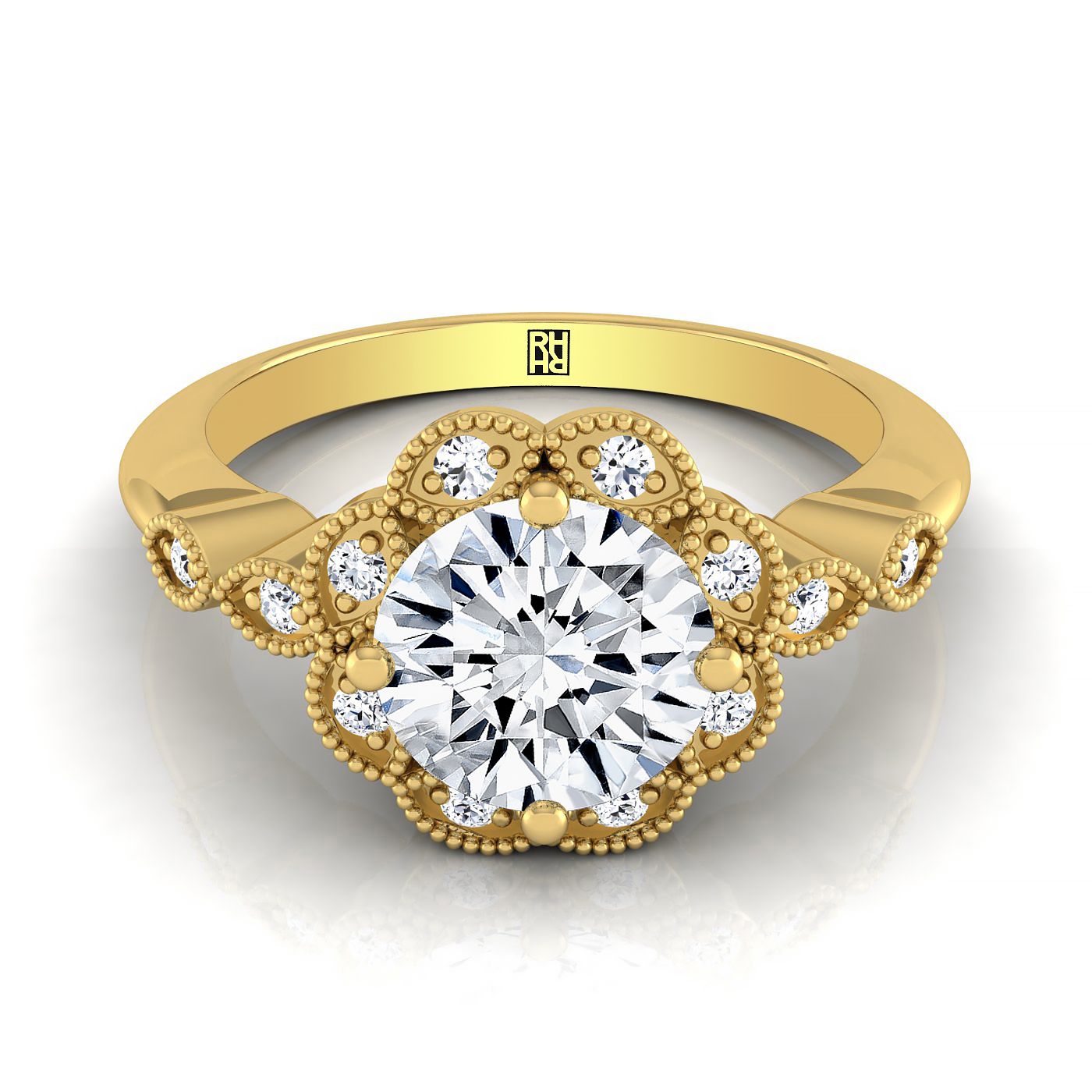 18K Yellow Gold Round Brilliant Antique Delicate Beaded Floral Halo and Leaf Engagement Ring -3/8ctw