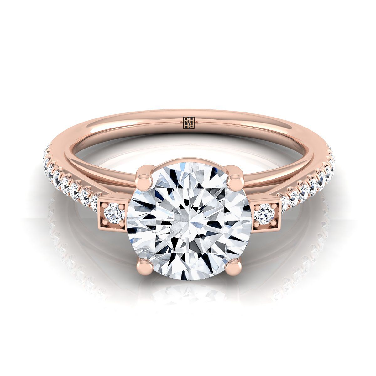 14K Rose Gold Round Brilliant Diamond Delicate Three Stone Pave Engagement Ring -1/3ctw