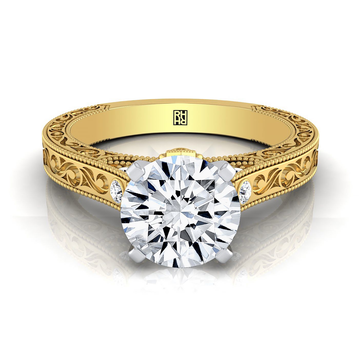 14K Yellow Gold Round Brilliant Delicate Diamond Accented Antique Hand Engraved Engagement Ring -1/10ctw