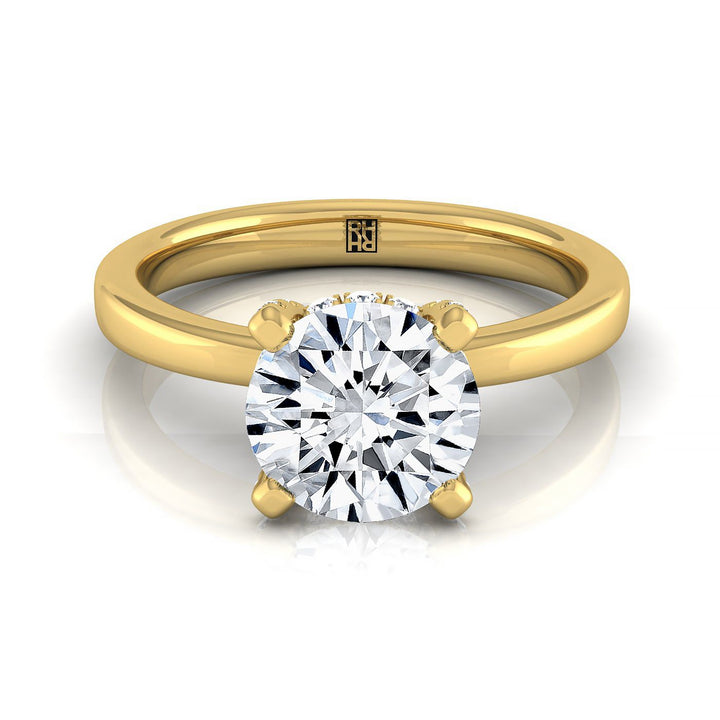18K Yellow Gold Round Brilliant Diamond Adorned Claws and Secret Halo Solitaire Engagement Ring -1/10ctw