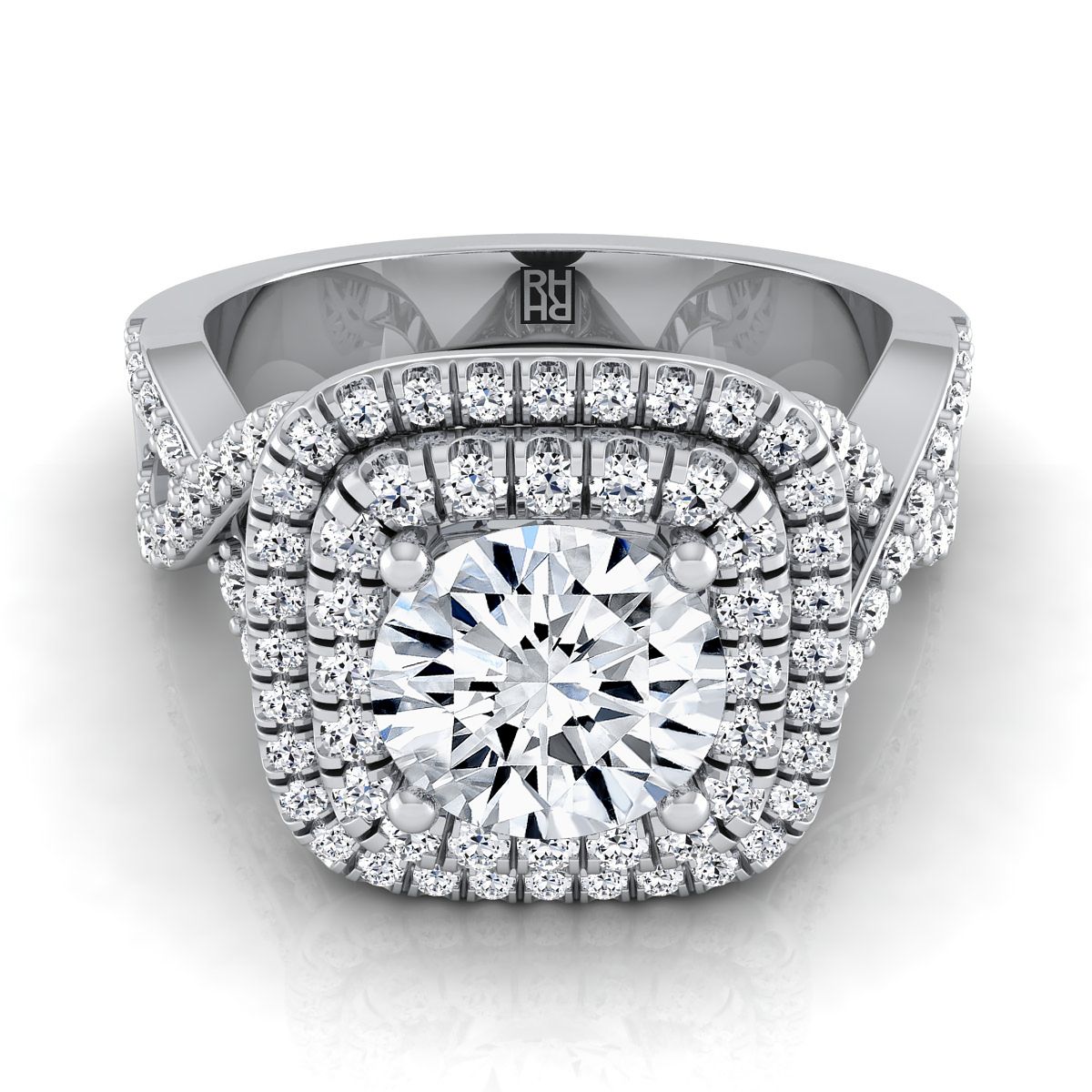14K White Gold Round Brilliant Diamond Twist French Pave Double Halo Diamond Engagement Ring -5/8ctw