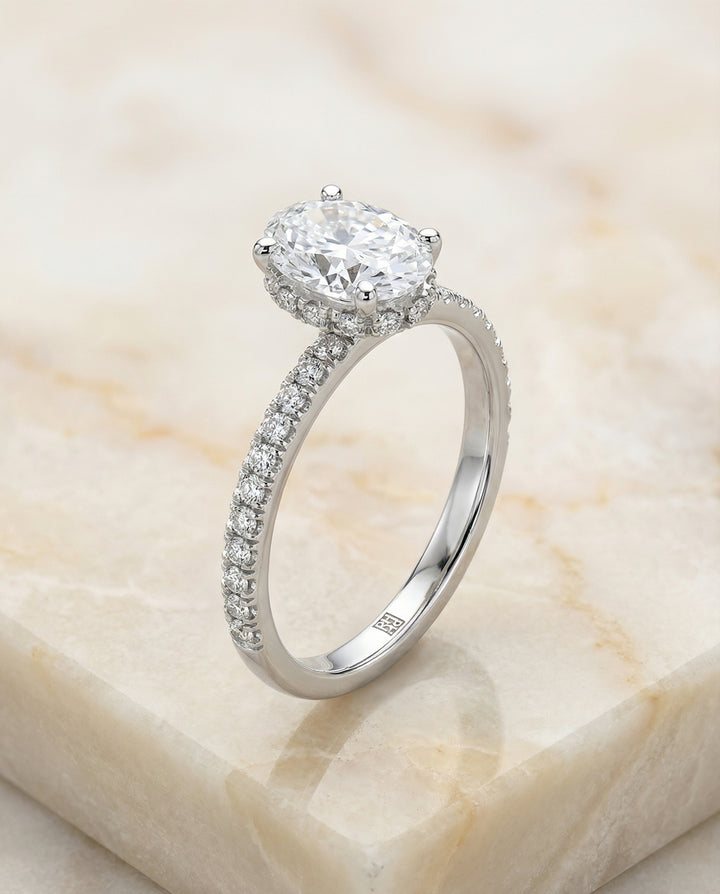 The Elliott hides its halo: from above it reads as a solitaire, but the halo ring sits just below the center stone's girdle — visible only when the ring catches light at an angle, making it a design with a subtle revelation built in.