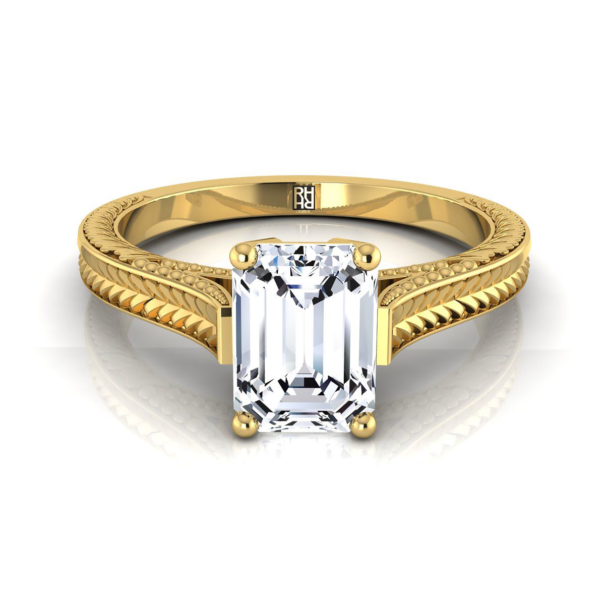Understated Elegance, This Emerald Cut Diamond Engagement Ring Showcases An Antique Inspired Engraved Design With A Classic Millgrain Finish In 14k Yellow Gold