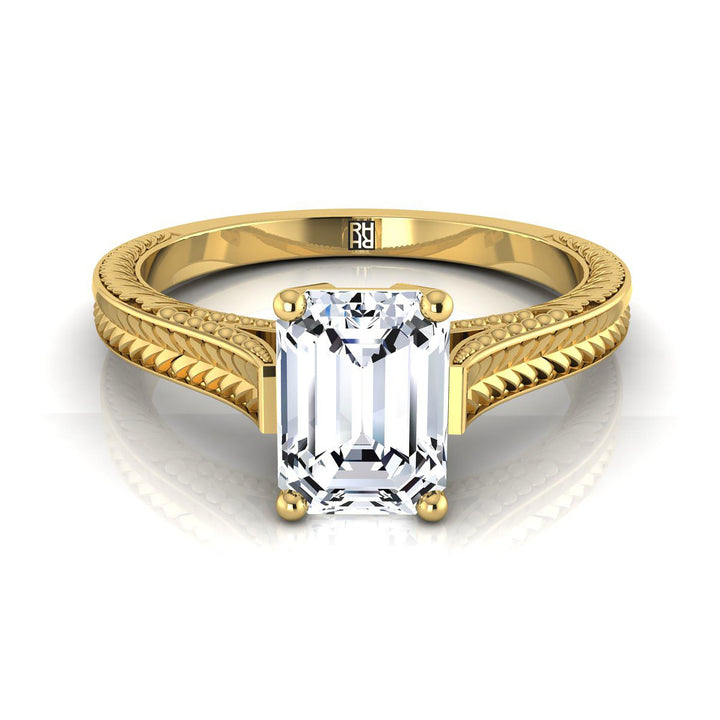 14K Yellow Gold Emerald Cut Hand Engraved Vintage Cathedral Style Solitaire Engagement Ring