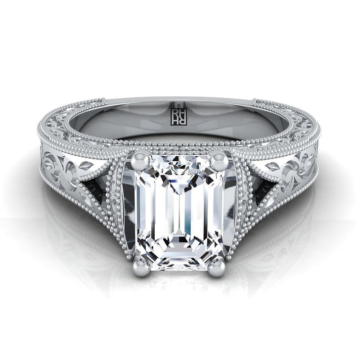 18K White Gold Emerald Cut Hand Engraved and Milgrain Vintage Solitaire Engagement Ring