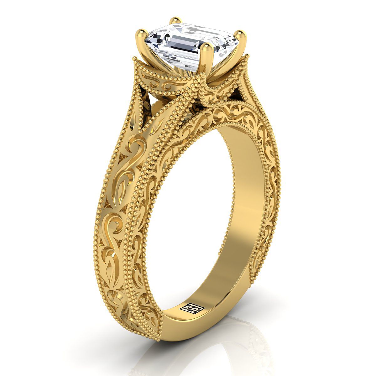 Understated Elegance, This Diamond Emerald Cut Engagement Ring In 18k Yellow Gold Showcases An Antique Inspired Engraved Design With A Classic Millgrain Finish.