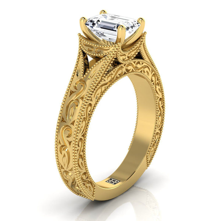 18K Yellow Gold Emerald Cut Hand Engraved and Milgrain Vintage Solitaire Engagement Ring