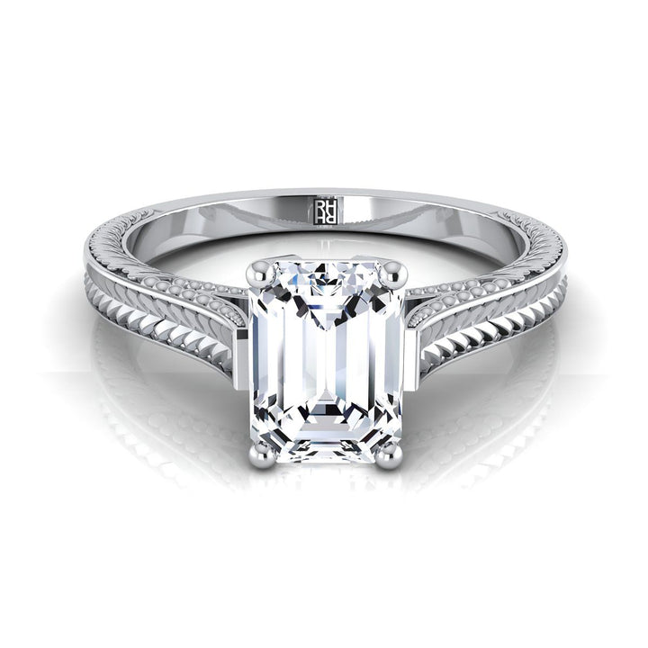 Platinum Emerald Cut Hand Engraved Vintage Cathedral Style Solitaire Engagement Ring