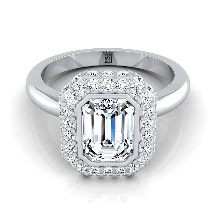 Elegant Emerald-cut Bezel-set Center And Pave Halo Diamond Engagement Ring With Flat Shank Featuring Round Brilliant Melee Diamonds (h-i/vs 0.40ctw) In A Classic 14k White Gold Setting