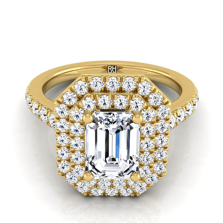 14K Yellow Gold Emerald Cut Double Pave Halo with Linear Diamond Engagement Ring -7/8ctw