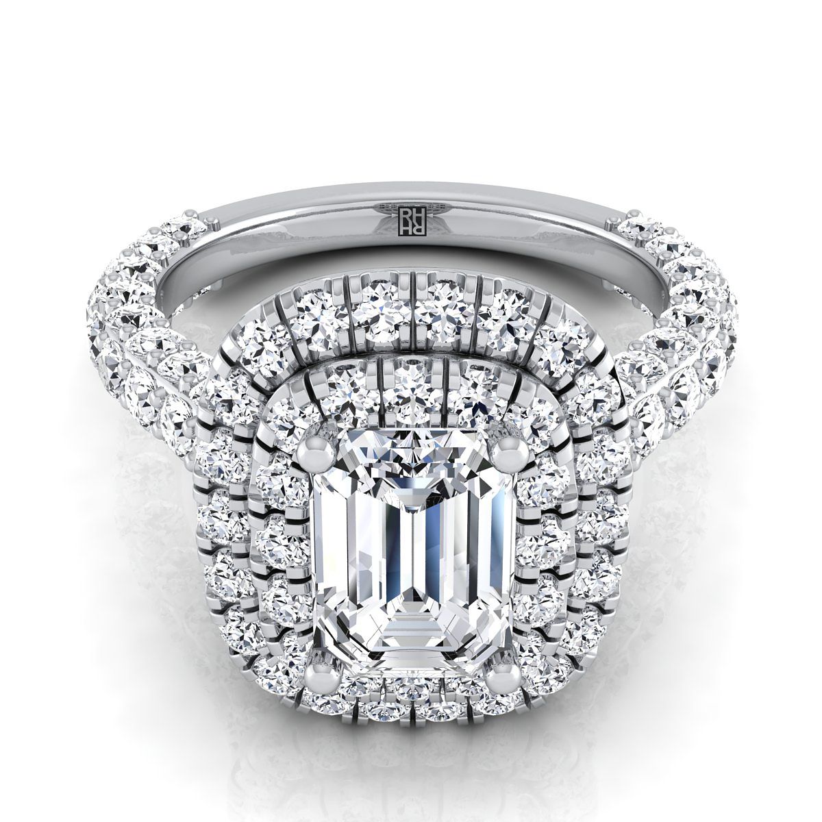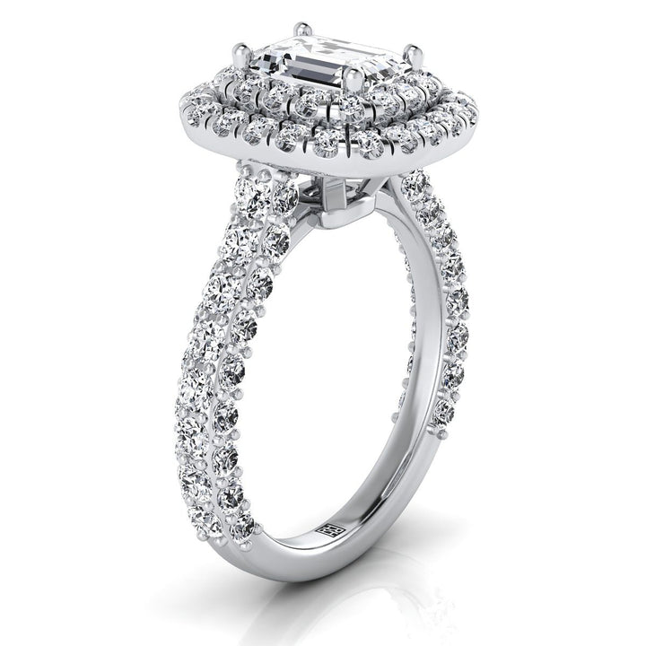 An Elegant Statement Of Style, This Emerald Cut Double Halo Pave Engagement Ring Showcases Brilliant Cut Diamonds (h-i/vs 2.15ctw) With An Exquisite Pave Shank Mounted In A Platinum Setting.